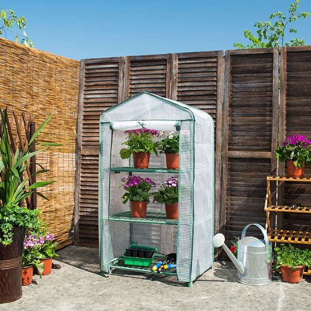 Starlived mini indoor / outdoor garden greenhouse. A PE cover protects plants from UV rays and inclement weather, including frost, excessive heat, and too much moisture. A zippered door allows you to control airflow in and out of the greenhouse to increase its growth. The greenhouse creates an ideal humid environment and protects plants from outside weather.